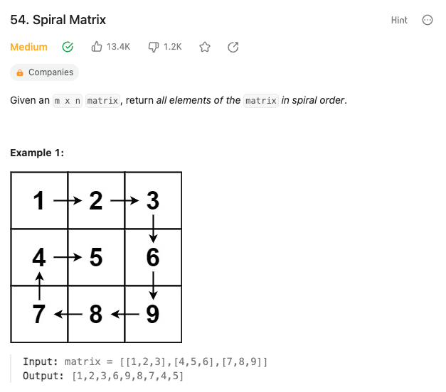 문제 https://leetcode.com/problems/spiral-matrix/description/ Spiral Matrix - LeetCode Can you solve this real interview question? Spiral Matrix - Given an m x n matrix, return all elements of the matrix in spiral order. Example 1: [https://assets.leetcode.com/uploads/2020/11/13/spiral1.jpg] Input: matrix = [[1,2,3],[4,5,6],[7,8,9]] Outpu leetcode.com Given an m x n matrix, return all elements of ..